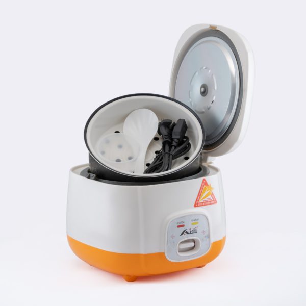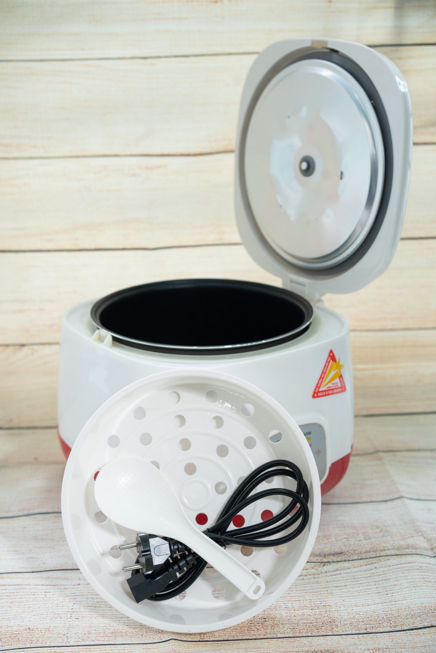 Phụ kiện: vỉ hấp, cốc đong gạo, thìa xới cơm, dây nguồn, HDSD, phiếu BH